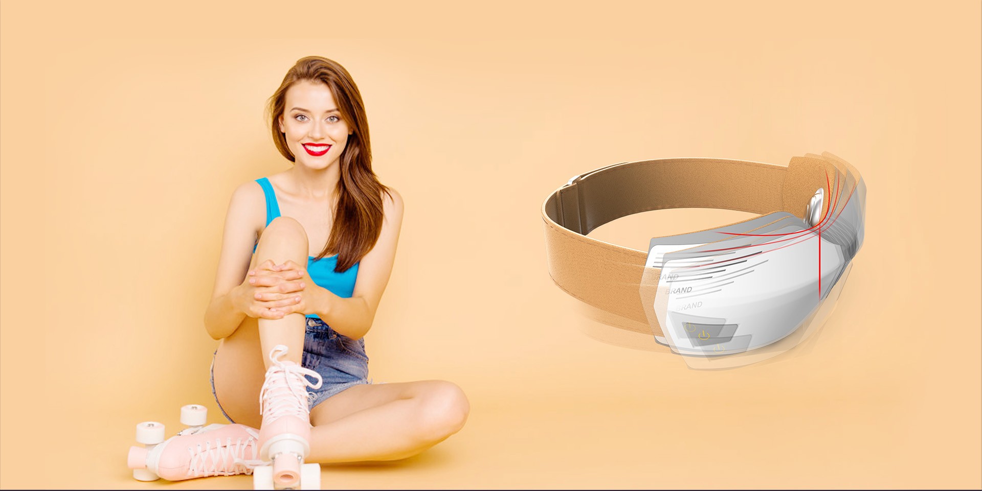 靈感來源于蝴蝶結(jié),將膝蓋兩穴位巧妙連接起來,整體也顯得輕巧。中間轉(zhuǎn)軸連接,外附硅膠包裹。貼合膝蓋部位用細(xì)絨材質(zhì),舒適更人機,魔術(shù)貼綁帶更方便調(diào)節(jié)尺寸適應(yīng)不同腿型。