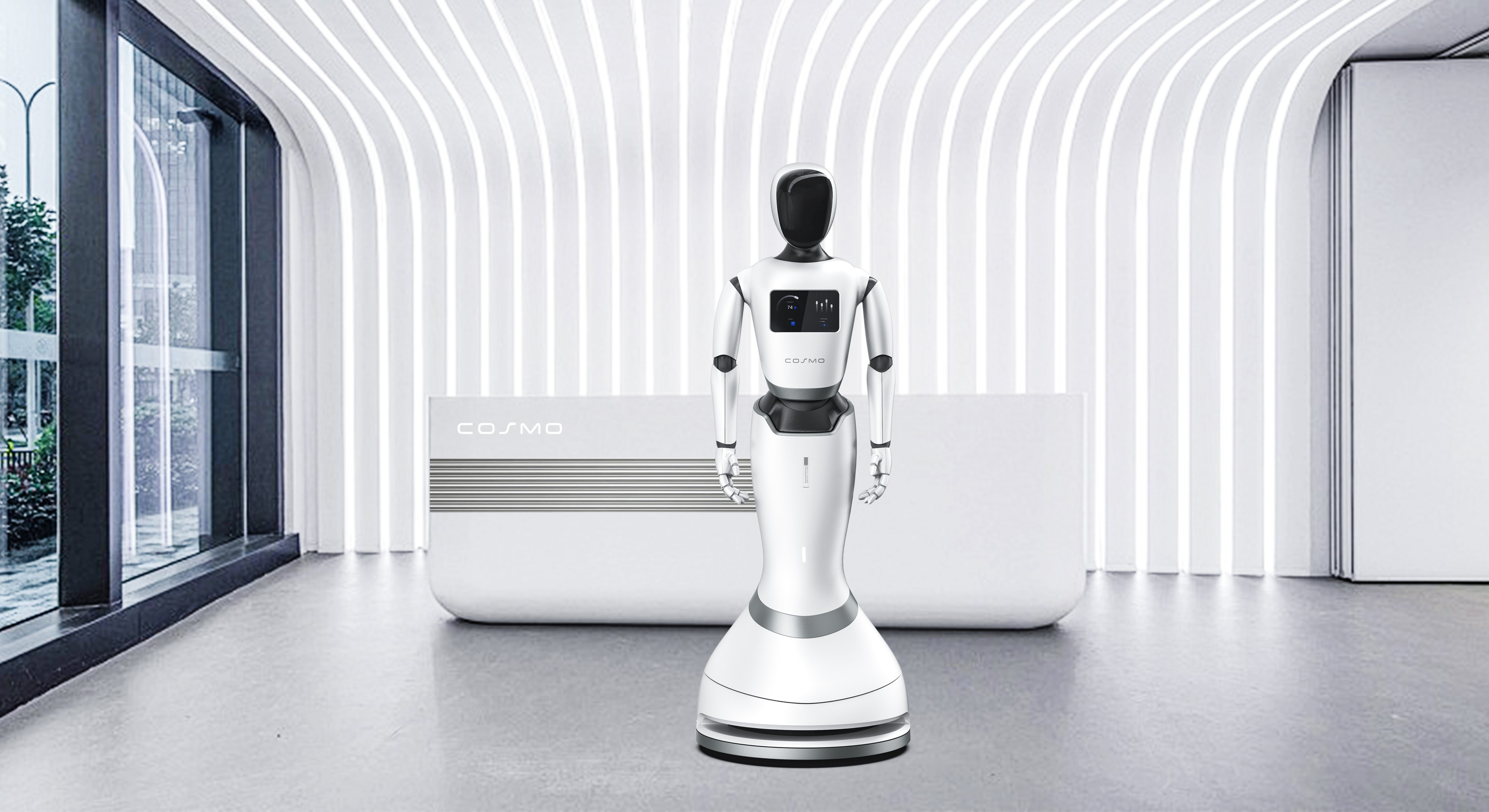 整體以純凈的白色為主色調(diào),搭配少量黑色線條點(diǎn)綴,簡潔又不失精致。它有著流暢的人體工學(xué)造型,頭部圓潤且配備深色的視覺模塊,仿佛一雙智慧的眼睛。軀干部分設(shè)計(jì)緊湊,胸前的屏幕與按鍵區(qū)域布局合理,方便交互操作。四肢關(guān)節(jié)處處理得自然流暢,既保證了運(yùn)動(dòng)的靈活性,又讓整體造型更具協(xié)調(diào)美感,底部的底座穩(wěn)固,支撐起整個(gè)機(jī)身,使其在現(xiàn)代家居環(huán)境中,宛如一件科技與藝術(shù)融合的精致擺件。